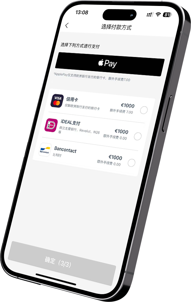 选择 iDEAL、Visa、Mastercard、Bancontact、Apple Pay或Google Pay 等方式完成充值。
